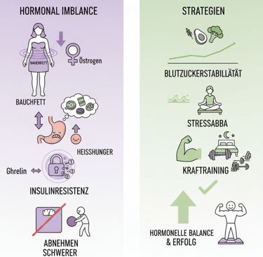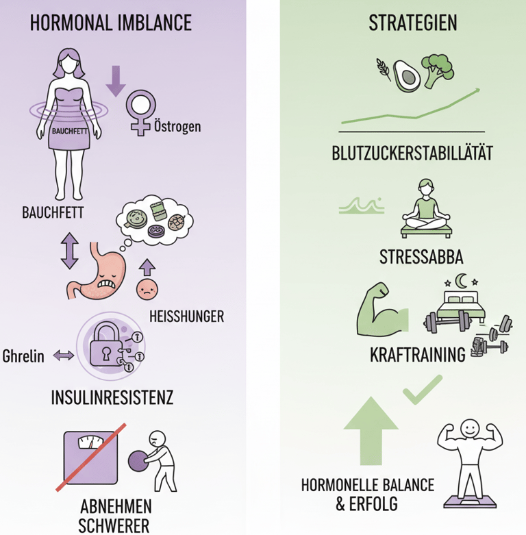 Mit sinkendem Östrogen verschiebt sich die Fettverteilung im Körper: Bauchfett nimmt zu, das Sättigungsgefühl lässt nach, und Heißhungerattacken können durch Hormonschwankungen häufiger auftreten. Gerade jetzt hilft es, gezielt auf regelmäßige, blutzucker-stabilisierende Mahlzeiten zu setzen.
